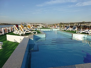 Heute ist ein Ruhetag angesagt. Um 10.30 legen wir wieder ab und fahren nach Kom Ombo, dabei verbringen wir die meiste Zeit am Oberdeck und genießen die ruhige Schifffahrt am Nil. |