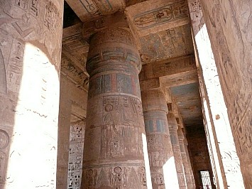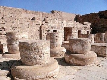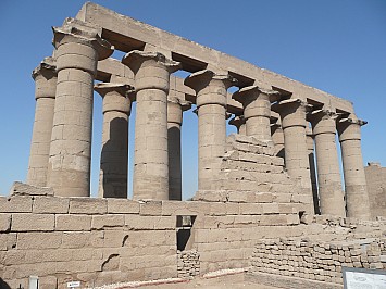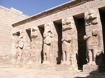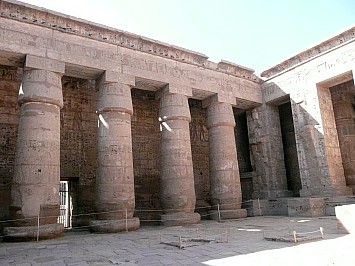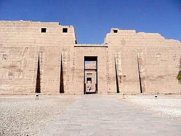 | Wir fahren wieder weiter und besichtigen den Tempel Medinat Habu der Totentempel von Ramses des III. Der Eingang erinnert an eine Festung. Der Tempel weist die übliche Abfolge auf Pylone, Höfe, Säulensaal und Opferraum. | |||