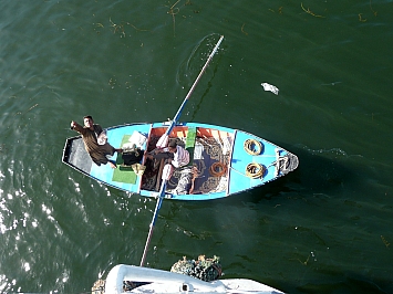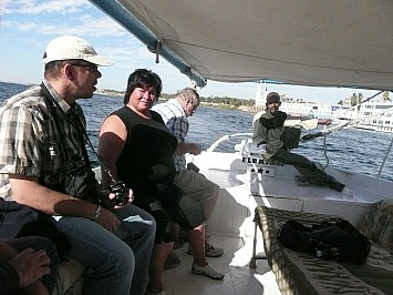 Um 9.30 setzen wir unsere Rückfahrt nach Luxor fort. Wir verbringen die meiste Zeit am Sonnendeck und genießen die Schifffahrt. Bei Esna passieren wir eine Schleuse, wo wir wieder von lästigen Souvenirverkäufer empfangen werden. |