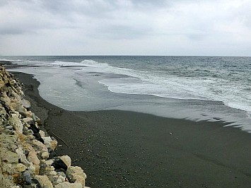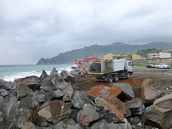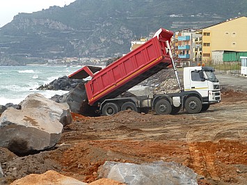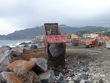 | Unmittelbar neben den Campingplatz werden riesige Felsblöcke abgeladen. Mit diesen sollen Wellenbrecher zum Schutz des Sandstrandes erricht werden. | |