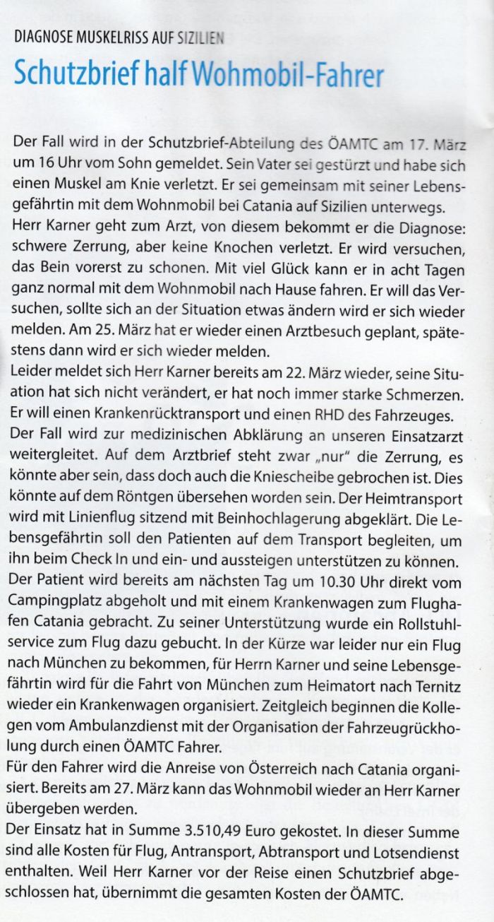 Über die gesamte Rückholung kann man den ÖAMTC nur höchstes Lob aussprechen, alles wurde bis in kleinste Detail beplant und durchgeführt. Wir können einen Schutzbrief des ÖAMTC nur empfehlen, hier sind echte Profi am Werk. |